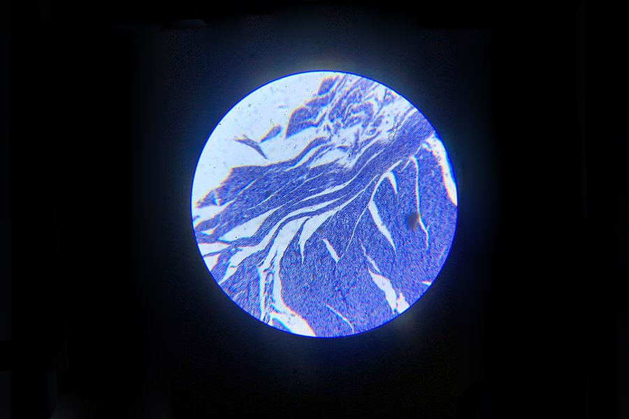 Cor rattus, sectionio longuitudinalis (heart of rats, longitudinal section). Micropreparatom on the optical glass. / Scotch on the pine. Moscow region, zoom lens, compact camera.