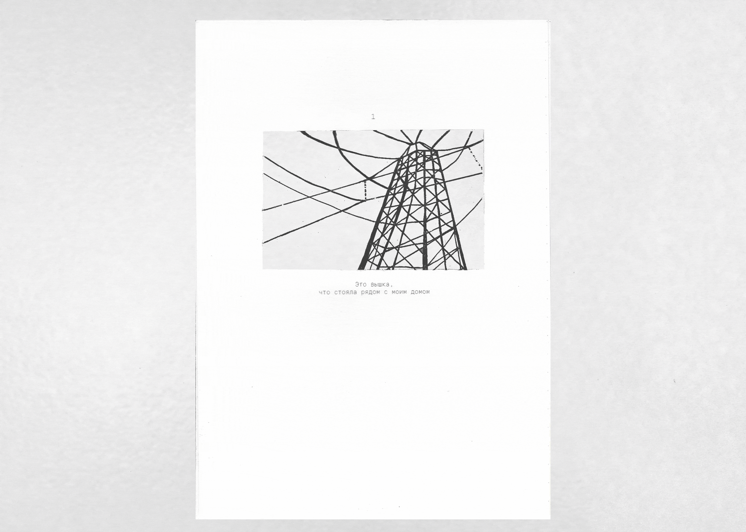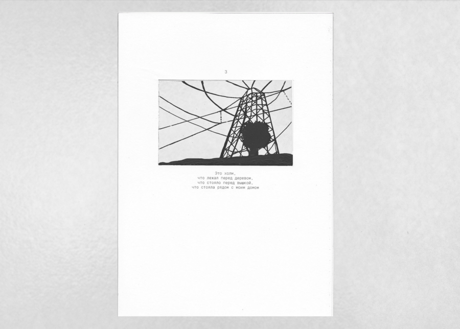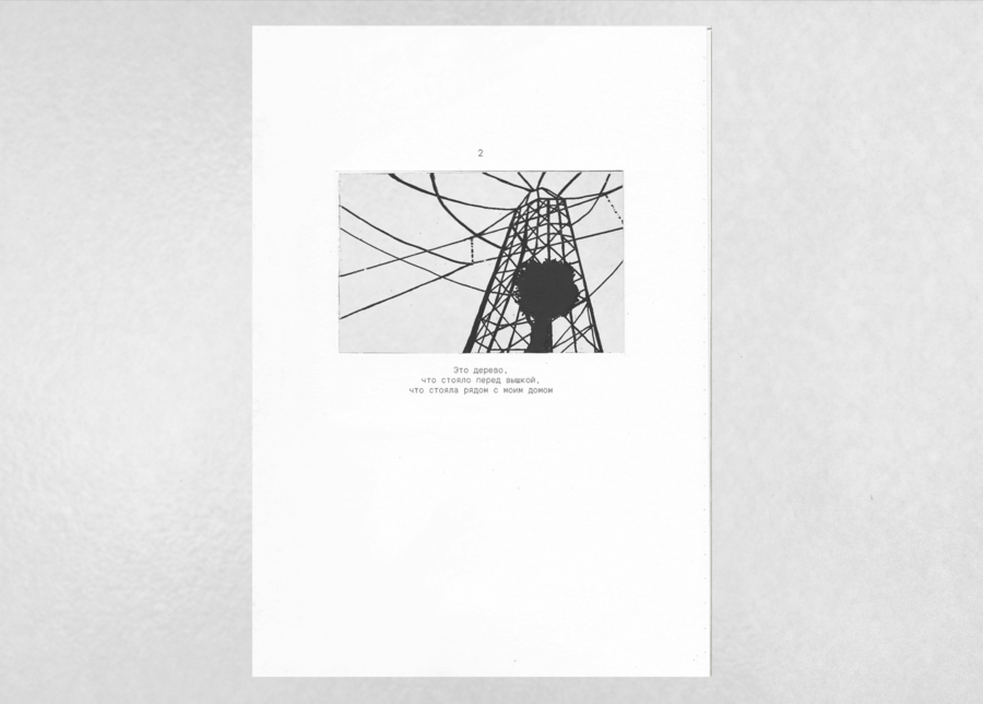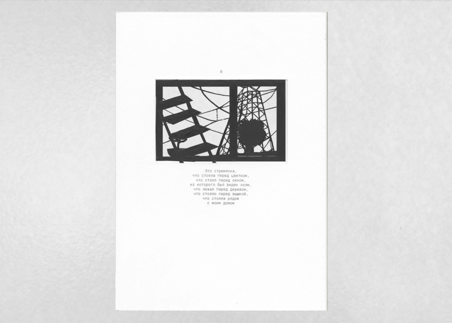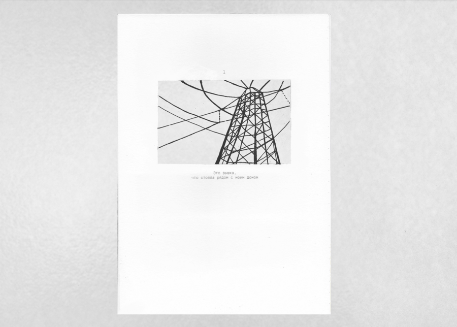 «Вышка, что стояла рядом с моим домом» — визуально-повествовательный фрактал, рассказ о персональном пространстве. Каждая новая страница влечет за собой весь груз предыдущего повествования, которое в итоге впадает в пустоту.