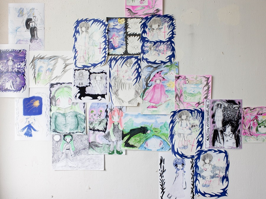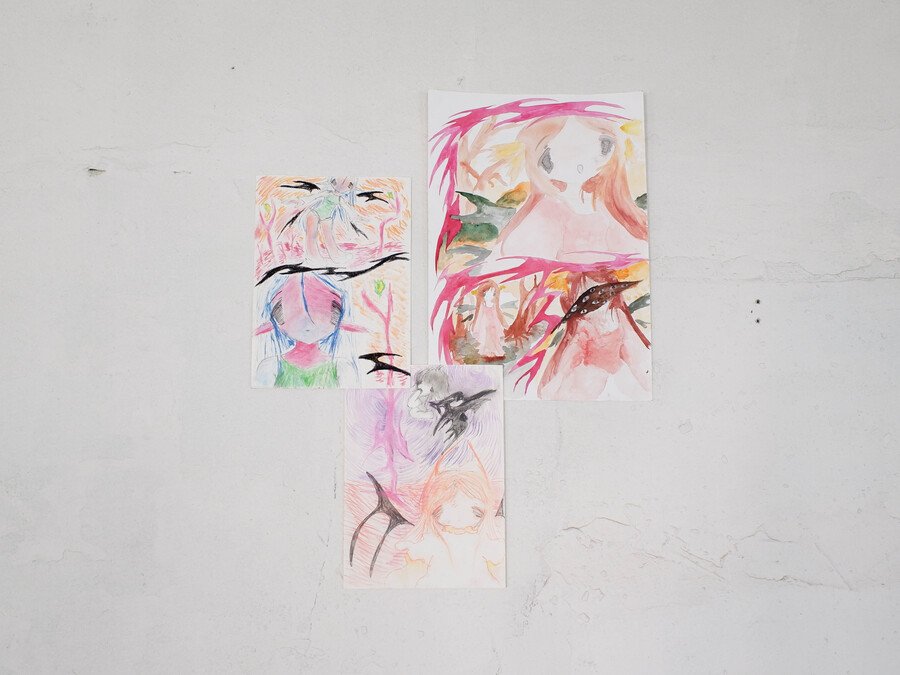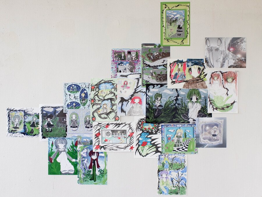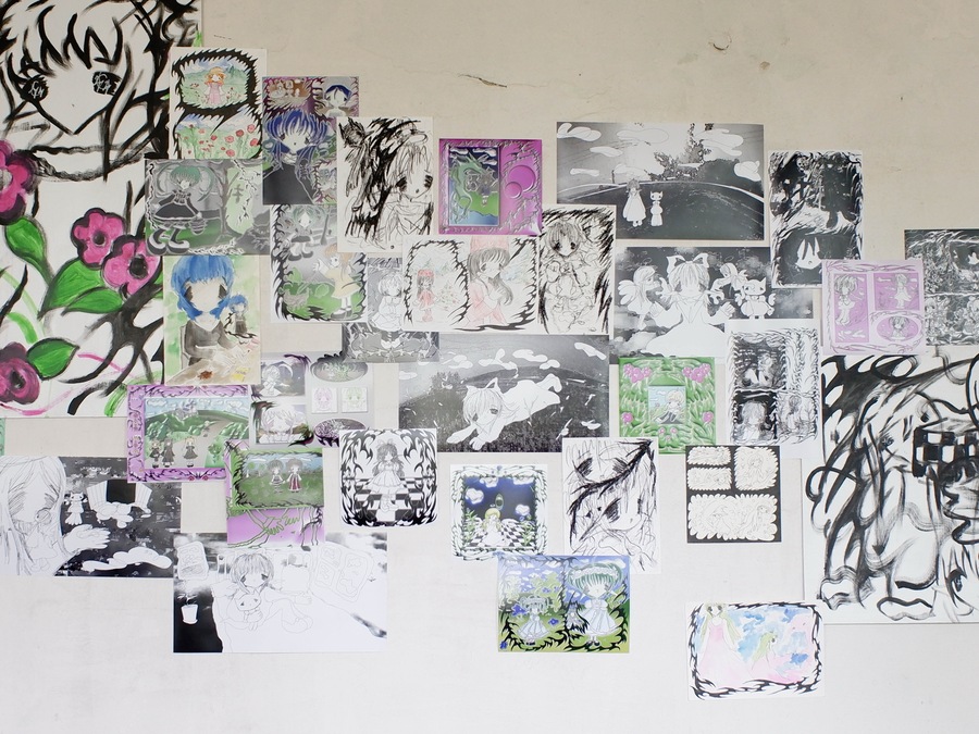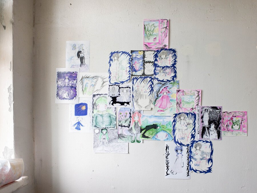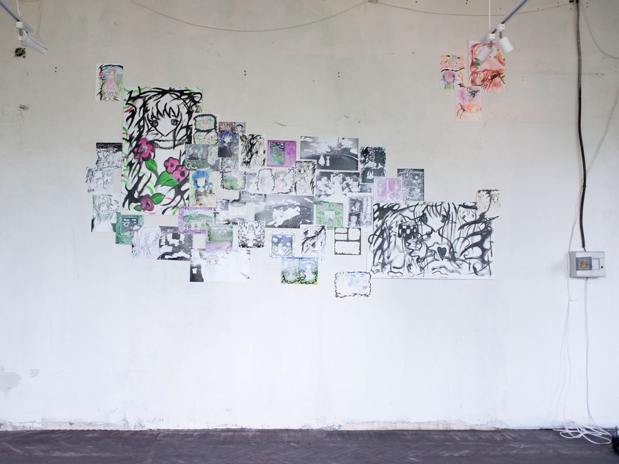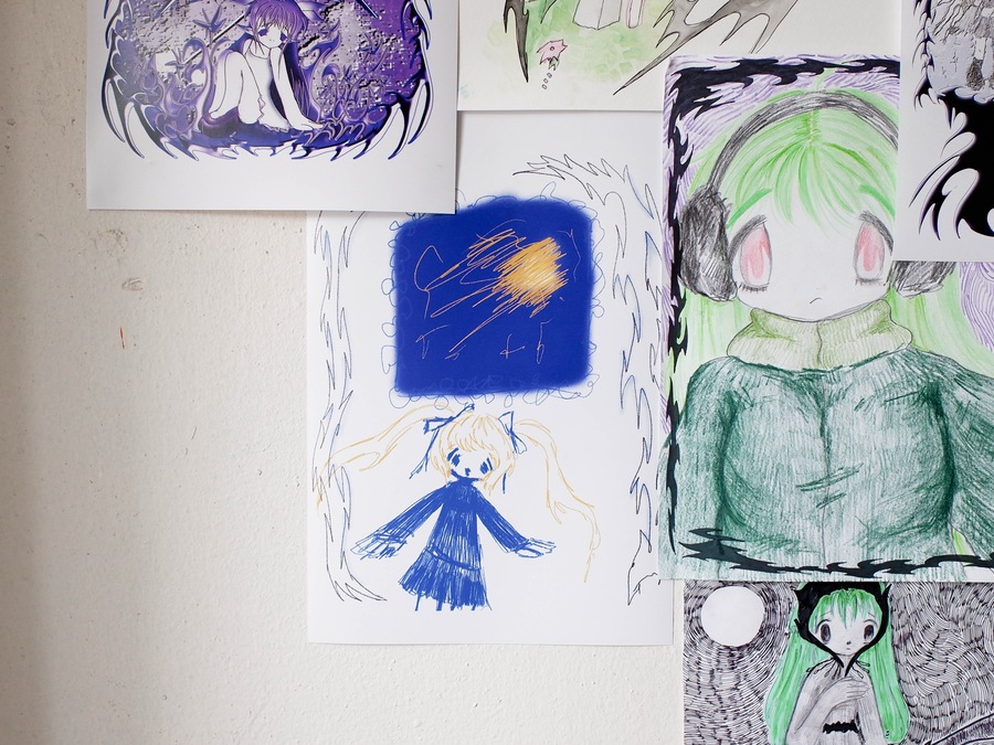 Soup’s works radiate sincerity, edging so close to childlike doodles that they make no attempt to demand attention. The gallery, hung with her pieces, bears no resemblance to a traditional exhibition space—instead, it feels like a teenager’s bedroom, chaotically plastered with hastily drawn sketches.