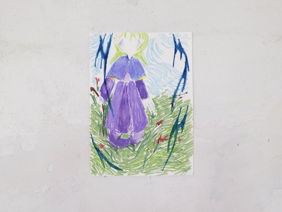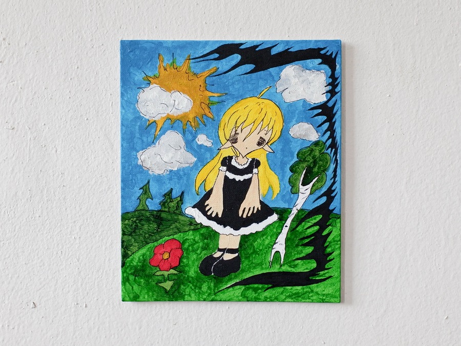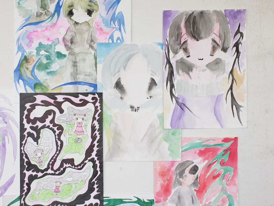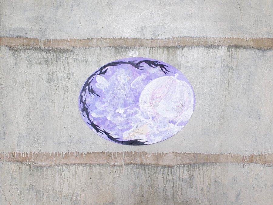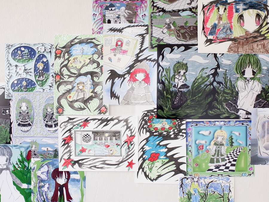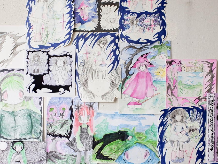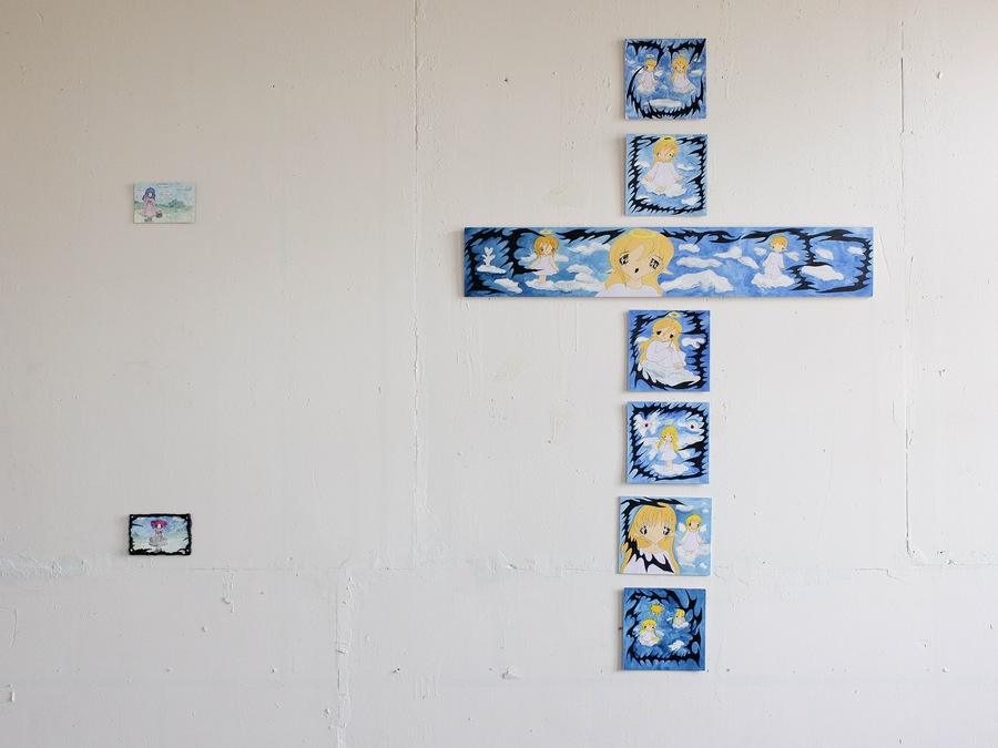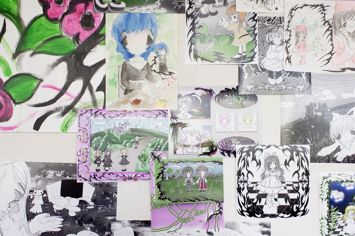 Soup’s works radiate sincerity, edging so close to childlike doodles that they make no attempt to demand attention. The gallery, hung with her pieces, bears no resemblance to a traditional exhibition space—instead, it feels like a teenager’s bedroom, chaotically plastered with hastily drawn sketches.