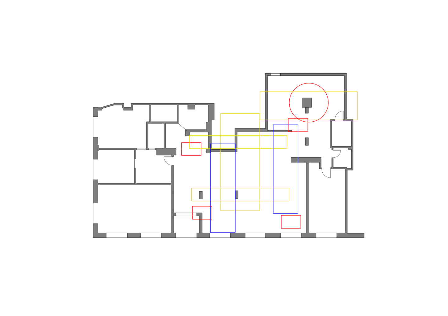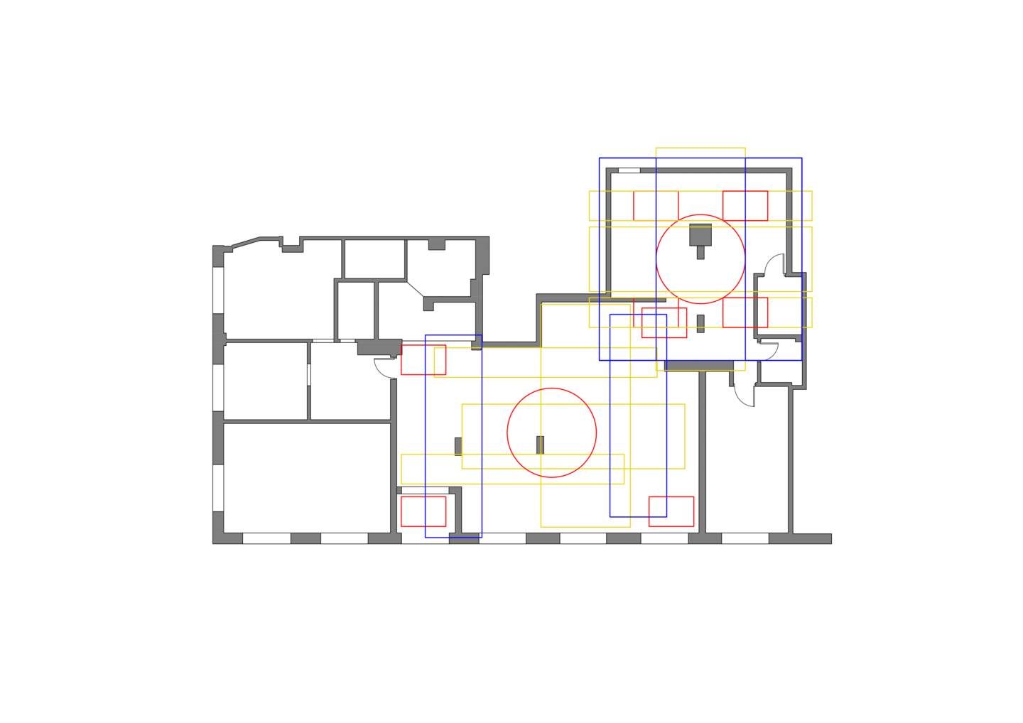 Я воспроизвела основные объемы здания в виде сверху, окрасив каждую группу объемов определенным цветом, как это было сделано в оригинале. А далее решила переложить эти объемы на план музея, при этом думая как о сценографии выставки, так и о композиционной привлекательности.