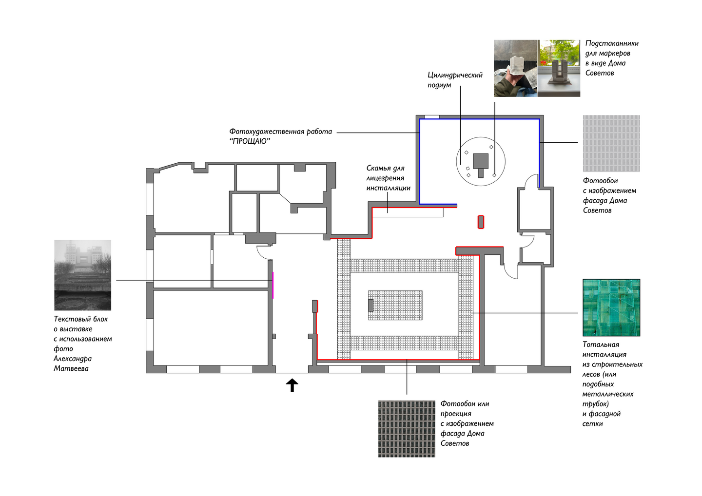 Этот вариант показался мне наиболее логичным. Несмотря на то, что я осознавала риск такой деконструкции здания, мне она казалась очень обоснованной. Помимо того, что у самого здания музея есть условные два зала, у Дома Советов также есть две часть — фундамент и основной объем. Фундамент как суть, как самостоятельный объем, как то, что снесли в последнюю очередь. Как то, что возникло первым и то, что стояло до последнего. В выставке этот объем играет роль катарсиса. Основной объем же выступает в роли привычного, узнаваемого и в некотором роде уже культового образа. «Прогулочная» часть Дома Советов как в жизни, так и на выставке. Пространство музея подсказало мне и этот прием, когда я увидела сходство существующих в зале колонн и бывших опор Дома Советов.