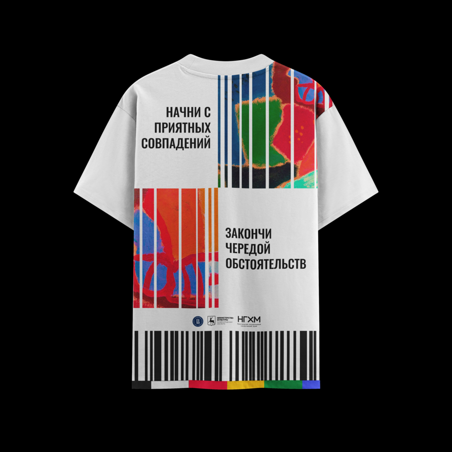 Мы потратили месяц на поиски образа, который в полной мере отражал бы идею выставки, и остановились на штрих-коде. Штрих-код — символ, в котором переплетаются разные по ширине и важности потоки, которые пронизывали Нижний и всю его историю