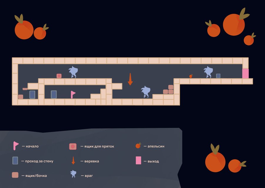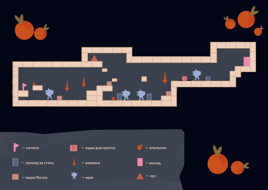 После выбора объектов для уровня и постановки задач, например, обучения новому взаимодействию был поэтапно составлен левел-дизайн.