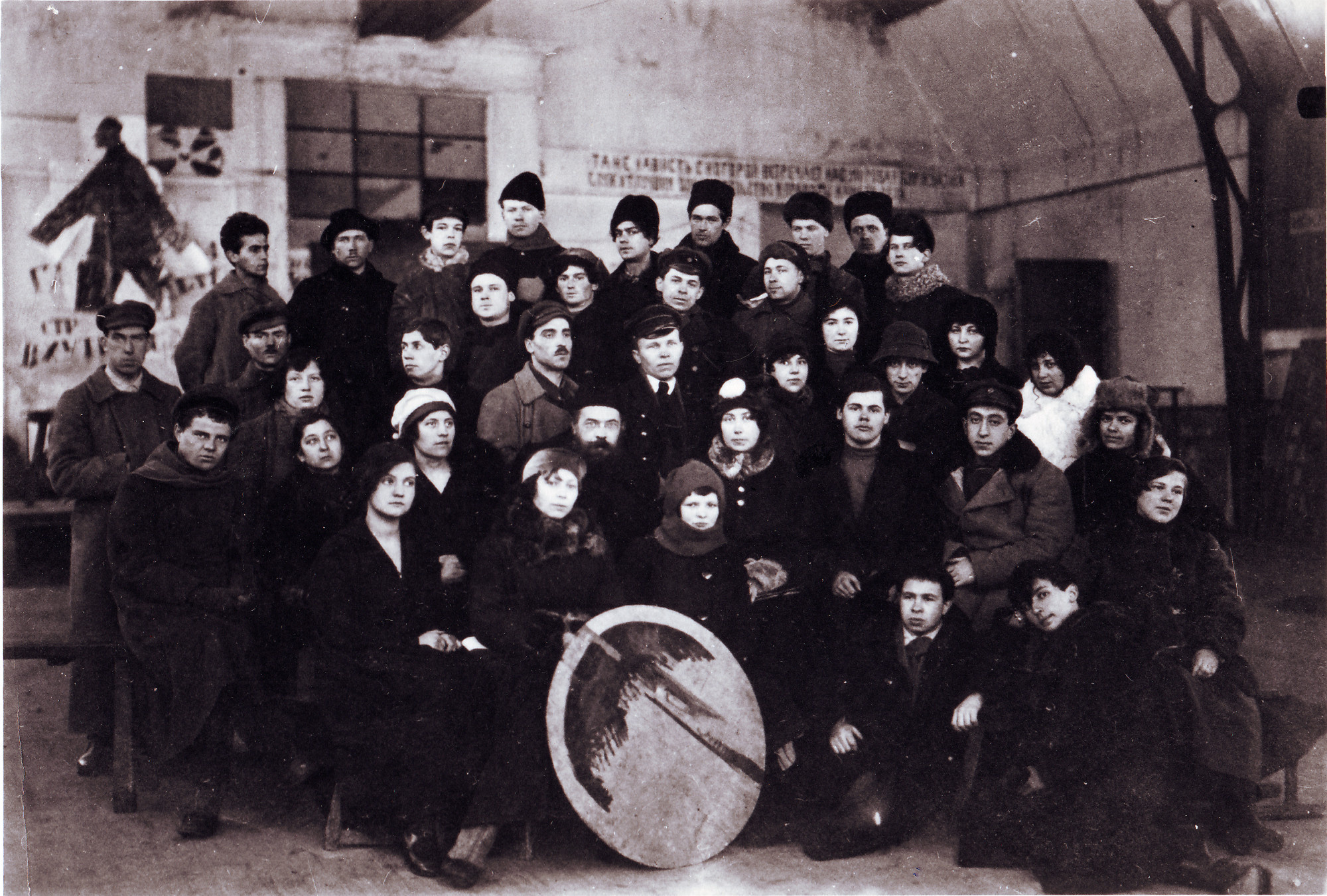 Любовь Попова и Александр Веснин со своими студентами во ВХУТЕМАСе, 1920-е годы.