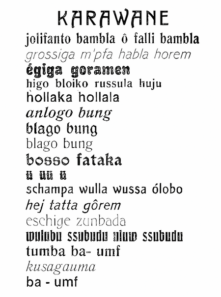 Слева: Хьюго Болл читает звуковую поэзию в Кабаре Вольтер, неизвестный фотограф, Справа: первая звуковая поэма Болла «Karawane»
